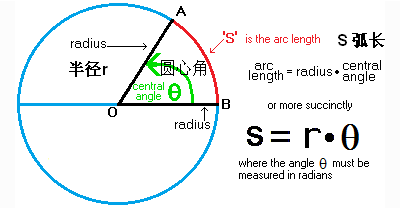 弧长(arc length)=[半径radius • 圆心角central angle]