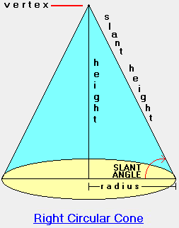 圆锥体积 = (π • r² • h) / 3 侧面积= (π • r • slant height)
